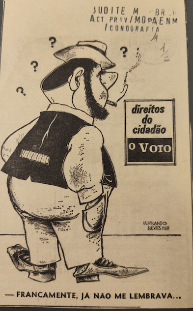 Este panfleto é um bom exemplo das relíquias que chegam até nós através dos nossos doadores. Trata-se de uma caricatura política que sublinha a importância do direito de voto. A legenda, “Francamente, já não me lembrava…”, reforça a crítica à falta de consciência cívica e ao esquecimento dos direitos fundamentais.
